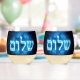 Glowing blue and white Hebrew text reading, "Shalom" (שלום - peace) superimposed on an elegant, blue, etched-look fractal image of a Star of David. Customise by adding your own text on the reverse side.