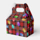 This festive design features glowing Christmas lights on a red tartan plaid.