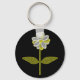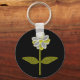 This pretty floral keychain features a digital image of a daisy with a green stem with two green leaves on it and white and yellow coloured petals with a yellow centre. The petals look like they are glowing with a beautiful reflective quality. The flower is on a black background for maximum contrast and the result is stunning.