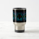 This travelers mug features three spooky faces with golden glowing eyes surrounded by an ornate square geometric pattern in shades of blue with accents of green and pink. They are set on a black background for a dramatic effect.