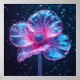 A surreal glowing flower featuring vibrant blue and pink translucent petals with droplets, set against a mystical, starry nighttime background. Intricate details and vivid colours enhance its ethereal appeal.