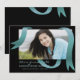 A modern invitation featuring a teal blue ribbon loosely hanging over your favourite photo with a black background.
