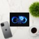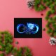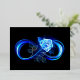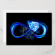 Luminous infinity symbol with glowing, beautiful, lushly blooming rose made of blue flames on black background.