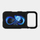 Luminous infinity symbol with glowing, beautiful, lushly blooming rose made of blue flames on black background.