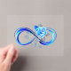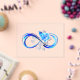 Luminous infinity symbol with glowing, beautiful, lushly blooming rose made of blue flames on black background.