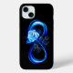 Luminous infinity symbol with glowing, beautiful, lushly blooming rose made of blue flames on black background.