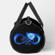 Luminous infinity symbol with glowing, beautiful, lushly blooming rose made of blue flames on black background.
