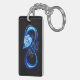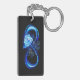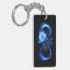 Luminous infinity symbol with glowing, beautiful, lushly blooming rose made of blue flames on black background.