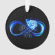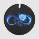 Luminous infinity symbol with glowing, beautiful, lushly blooming rose made of blue flames on black background.