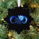 Luminous infinity symbol with glowing, beautiful, lushly blooming rose made of blue flames on black background.