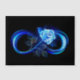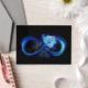 Luminous infinity symbol with glowing, beautiful, lushly blooming rose made of blue flames on black background.