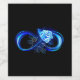 Luminous infinity symbol with glowing, beautiful, lushly blooming rose made of blue flames on black background.