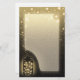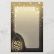 A glowing jar of golden yellow fireflies on a dark night background speckled with stars and lit up by the glow of the fireflies. A beautiful trail of fireflies sparkles like golden glitter in an arch across the night sky. An elegant nostalgic design that reminds of summertime when the lightning bugs glow and light up the warm summer nights. The lightened writing area on a pretty night sky with stars background is unlined.