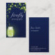 A glowing jar of lime green fireflies on a dark blue night sky background. An elegant and nostalgic design that reminds of summertime when the lightning bugs glow and light up the warm summer nights. Custom vertical business information template fields for you to make it your own, including name, title, and contact information. The back has a simple matching blue background with white text.
