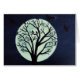 A spooky halloween themed graphic. A large full moon glowing brightly set behind an old dead craggy tree with crows sitting on its branches. Many birds flying around the deep blue star speckled sky.