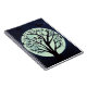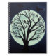A spooky halloween themed graphic. A large full moon glowing brightly set behind an old dead craggy tree with crows sitting on its branches. Many birds flying around the deep blue star speckled sky.