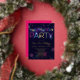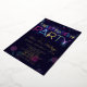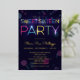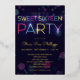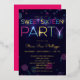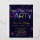 Sweet Sixteen party invitation in dark purple with glowing neon letters and bokeh and gold foil wording. Perfect for a glow in the dark themed occasion.