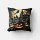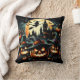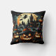 Three intricately carved pumpkins emit an eerie glow, surrounded by bats and a haunted castle backdrop under a full moon. Halloween magic is in the air.