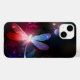 Glowing, flying, red dragonfly, with transparent, detailed wings on dark, nocturnal, luminous background with tropical plants and fireflies. Red dragonfly.