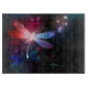Glowing, flying, red dragonfly, with transparent, detailed wings on dark, nocturnal, luminous background with tropical plants and fireflies. Red dragonfly.