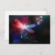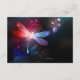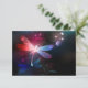 Glowing, flying, red dragonfly, with transparent, detailed wings on dark, nocturnal, luminous background with tropical plants and fireflies. Red dragonfly.
