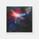 Glowing, flying, red dragonfly, with transparent, detailed wings on dark, nocturnal, luminous background with tropical plants and fireflies. Red dragonfly.