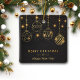 This dramatic Holiday ornament is as pretty as it is unique. Black and gold is always elegant and here is no exception. Gold line ornaments have a dusting of tiny gold confetti and gold star lights on a black background. At the bottom is gold text that says "MERRY CHRISTMAS & Happy New Year". The back of the ornament has the same ornament design, with two custom text fields.