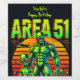 Two alien beings with piercing red eyes stand prominently under vivid neon skies. Hovering UFOs add to the surreal atmosphere, set against a bold, colourful backdrop. This artwork brings together the mystery of extraterrestrials and the allure of Area 51 in an electrifying, retro-futuristic style.