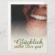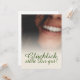 Kompliment Karte mit lachendem Frauengesicht und handschriftlichen Grüßen auf der Vorderseite der Karte. Restliche Flächen stehen zur freien Verfügung.