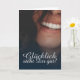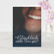 Kompliment Karte mit lachendem Frauengesicht und handschriftlichen Grüßen auf der Vorderseite der Karte. Restliche Flächen stehen zur freien Verfügung.