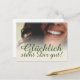 Kompliment Karte mit lachendem Frauengesicht und handschriftlichen Grüßen auf der Vorderseite der Karte. Restliche Flächen stehen zur freien Verfügung.