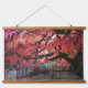 Decorate your living space with this horizontal, hanging wall tapestry with wooden tops that features the photo image of a gnarly Japanese maple tree with flaming, red leaves alongside an ornamental bamboo fence.