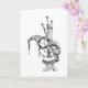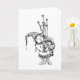 Vintage line drawing of round faced gnome playing a set of over sized bagpipes.