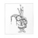 Vintage line drawing of round faced gnome playing a set of over sized bagpipes.