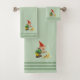 Cute gnome with gold coins and three stripes on light laurel green. Elegant modern towel set. Image only on one side.