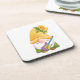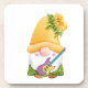 Gnome playing a guitar with a sunflower on his hat on a beverage coaster set.