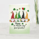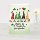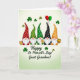 This card shows five St. Patrick’s Day gnomes lined up shoulder to shoulder across the centre, their round bodies and long white beards giving them a cosy, companionable look 💚. On the left, a gnome in a red polka-dot hat raises a golden mug, as if toasting the others, while two green-hatted gnomes beside him wear swirling patterns that echo the shamrocks around them ☘️. Near the right side, a gnome in a black hat holds red and green balloons that float upward like a small parade, and the last gnome wears an orange-striped hat while presenting a shiny pot of gold. Their hats and props pop against a light green gradient background, with soft shading that makes the figures look gently rounded and close together, like friends leaning in for a photo. Small shamrocks in different green tones are scattered around the lineup, filling the space without crowding the characters. The message “Happy St. Patrick’s Day! Great Grandma!” sits in dark green lettering, placed above and slightly over the group so it reads clearly at a glance. The gold mug, balloon strings, and the pot’s bright highlights add little points of shine among the reds, greens, black, and orange. A sprinkling of shamrocks frames the gnomes on both sides against the pale green backdrop.