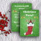This party invitation is green with a swirl pattern and a red fur trimmed Christmas stocking with a cute bearded gnome in a red hat inside along with holly leaves, red berries, and candy canes. More holly leaves and berries on yellow ribbons are on each side. Customise your information on the front and back with the templates.