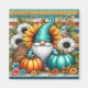 A cheerful gnome surrounded by colourful pumpkins, sunflowers, and other flowers, set against a vibrant striped backdrop. The scene exudes a whimsical and festive autumn atmosphere.