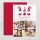 Minimal photo collage holiday card featuring your 4 photos, three cute nordic Christmas gnomes with red and white seasonal Scandinavian style hats and tunics, "Merry Christmas" in a red script and your name and the year in simple modern red typography.