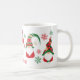Personalized fun Christmas mug featuring five cute funny Scandinavian-style gnomes with a seasonal red and green hats surrounded by red, green and gold snowflakes. You can easily personalize with a name at the bottom.