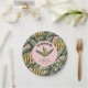 These playful "Go Bananas!" green and yellow personalised paper plates feature hand drawn yellow banana bunches and tropical green banana leaves against a pink background with subtle raindrop detailing in a lighter pink. All text is editable. Personalise with Name, Event and Date.