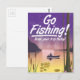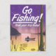 Go Fishing! Funny vintage or retro style travel poster of a fisherman on a lake during the evening sunset.