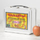 This is a standard metal lunchbox that appears to work just fine. We designed this box ourselves with an uploaded photo and custom text on the front and back. It looks absolutely beautiful except the front of the lunchbox is not centered like it shows in the photo. The print borders don't align with the inset flat part of the box where the preview photo online showed it perfectly centered in there. The back looks nice and centered though.