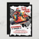 Trendy, modern Go Kart birthday party invitation. Design features typography script ''It's Race Time'' in red lettering , colourful go kart rider illustration, and chequered flag pattern on a white background. Personalise with a name, age and party details in trendy capital lettering. Suitable for any age.