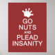 "Go nuts and plead insanity". Using the "customise it" function, you can change (edit) the background colour of this item and add your own text if you wish. See my store for more items with this design.