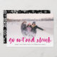 Festive holiday photo card features your favourite horizontal or landscape orientated photo in full bleed, with "go out and sleigh" overlaid in bright pink hand lettered brush typography for a trendy, youthful look. Personalise the front of the card with your names and short holiday message, and add three additional photos to the back in a collage layout on a black and white snowflake patterned background, along with a custom personal message. For a blank back, simply delete the photo templates and white matte layer.