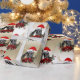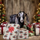 Cute Nubian baby goat with Santa hat and antlers adorned with striped Christmas ornaments, surrounded by a holiday wreath of red poinsettias , pine cones, greenery and a big red bow. A © goatlady GetYerGoat™ original - Best for medium to larger packages, the design is approx 6 inches for each goat -