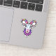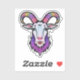 A whimsical goat head sticker with a playful expression, wearing a colourful, patterned hat. The eye-catching design features a pair of curved horns, a bushy beard, and a cheeky grin. The background is a pastel gradient of pink, purple, and blue, creating a vibrant and joyful atmosphere.