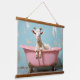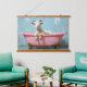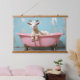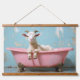 A whimsical painting featuring a white goat with horns relaxing in a vintage pink bathtub, set against a light blue wall for a charming and playful rustic scene.
